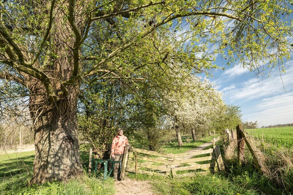 Het duurt niet lang voordat de eerste fruitbomen zich aandienen. De peren staan vol in bloei; de meeste appelsoorten volgen spoedig, maar zijn ook nu al fraai met hun rode knoppen. In het grasland is het de beurt aan de zachtroze bloeiende pinksterbloemen.