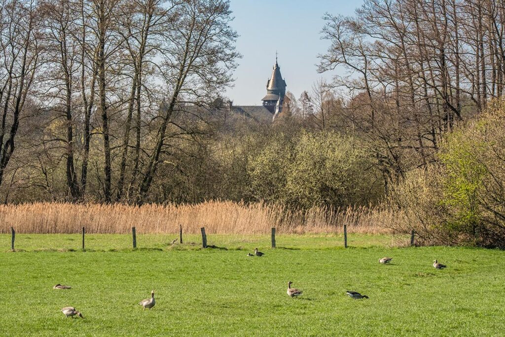 Vanuit het niets laat je ineens het vlakke land achter je en begint de beklimming van de Taubenberg, lokaal bekend als de ‘Hinsbecker Schweiz’. Via de oude galgenberg bereik je de enorme uitzichttoren, of moet je zeggen: de twee op elkaar geplaatste torens? Voor de bovenste toren betekent hoogtevrees een no go. Via 138 treden klim je 29 meter omhoog en sta je op 110 meter hoogte boven de zeespiegel. In de verte pronkt Schloss Krickenbeck, een machtig kasteel uit de dertiende eeuw, te midden van de Krickenbecker Seen. Zo snel je boven bent, sta je ook weer aan de voet van de Taubenberg. Nog eenmaal pronkt de toren van het kasteel tussen de elzen en wilgen, grauwe ganzen kortwieken het gras of luieren lekker in het lentezonnetje. Tijd om hetzelfde te doen!